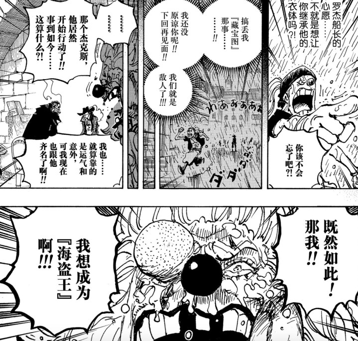香克斯开始对大秘宝下手啦,为啥呢?因为路飞都成长起来了,还觉醒了太阳神尼卡形态,都能跟香克斯平起平坐咯。巴基一看香克斯都行动了,他多年的梦想又被点着啦。他自己好歹也是四皇之一,寻思着为啥不拼一把呢,于是也加入到这大秘宝的争夺里头。