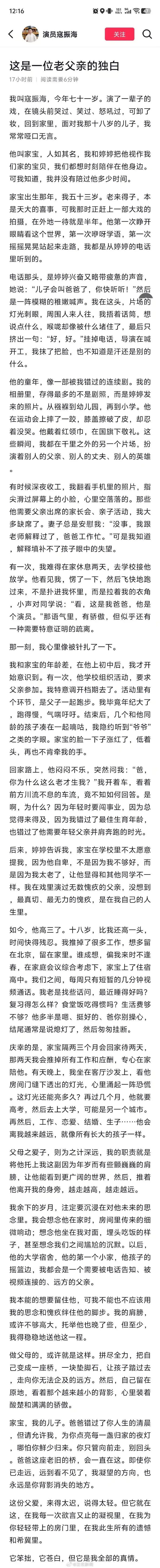 12月29日,演员寇振海发长文“这是一位老父亲的独白”。文中写道:自己今年71岁了,面对18岁的儿子常常哑口无言。老来得子,因为演戏错过了儿子的成长,也因为和儿子的年龄差,让儿子显得和其他同学不一样,充满了遗憾。但作为父亲,将托举他,稳稳地送他这一程。
